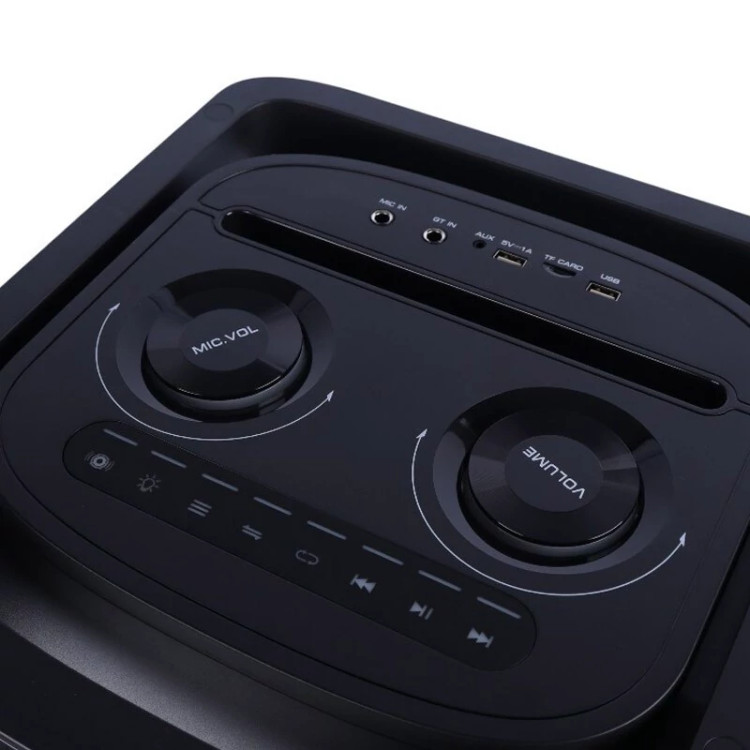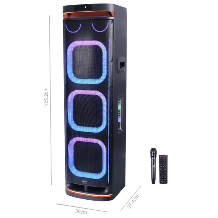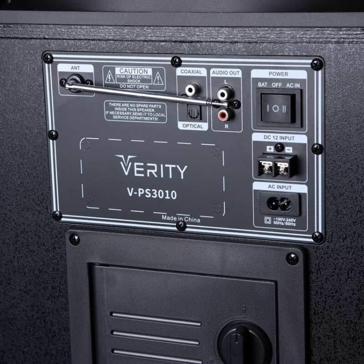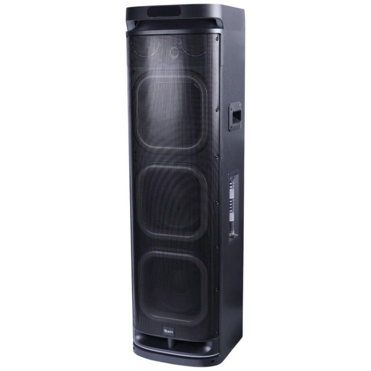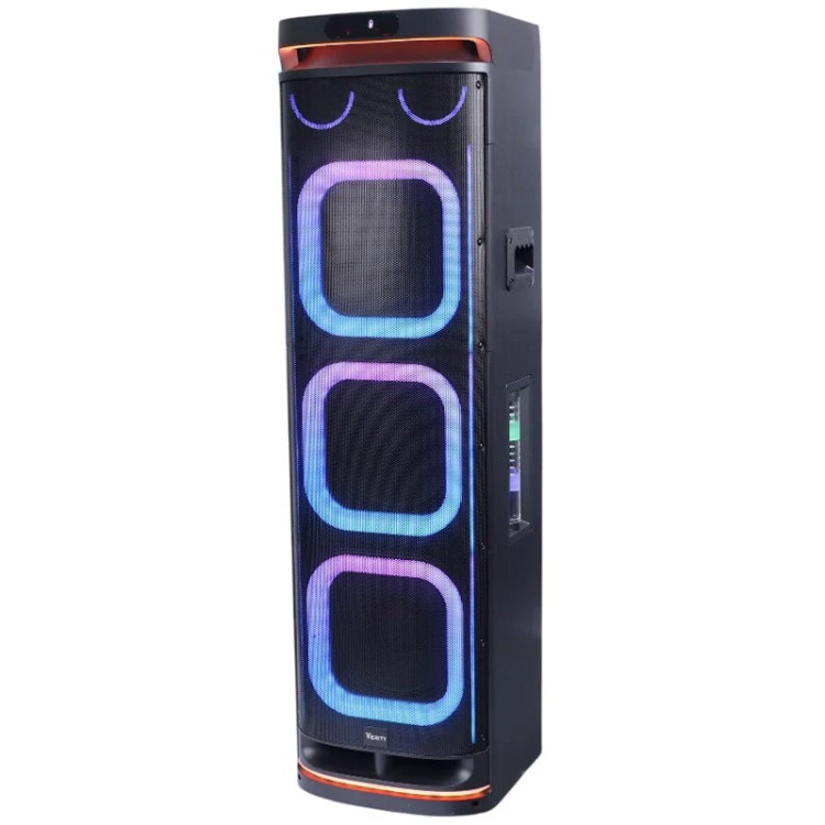اسپیکر خانگی ایستاده Verity V-PS3010 + میکروفون و ریموت کنترل اسپیکر بی سیم وریتی مدل VS-PS3010 به همراه ریموت کنترل و میکروفون دارای 3 ساب ووفر 10 اینچی، امپدانس برابر با 4 اهم و میزان حساسیت 86 دسی بل توان اسمی (P.M.P.O) برابر با 1200 وات، توان واقعی (RMS) معادل با 100 وات مجهز به درگاه USB به منظور شارژ اضطراری دستگاه های سازگار، مجهز به 2 عدد هولدر میکروفون پشتیبانی از بلوتوث به منظور برقراری ارتباط بی سیم و قابلیت برقراری ارتباط با سیم از طریق درگاه AUX برخورداری از فناوری TWS به منظور متصل شدن همزمان دو یا چند اسپیکر از این مدل به یک منبع بلوتوثی واحد مجهز به استند موبایل، برخوردار از نورپردازی RGB به منظور ایجاد جلوه بصری زیبا در محیط کم نور و تاریک امکان پشتیبانی از رادیو FM برای دوستداران برنامه های رادیویی، دارای آنتن اکسترنال، مجهز به ورودی Optical و Coaxial پشتیبانی از رم میکرو اس دی و فلش مموری جهت پخش فایل های ذخیره شده، دارای یک عدد ورودی گیتار و یک عدد ورودی میکروفون مجهز به کلیدهای فیزیکی و چرخشی متنوع جهت مدیریت ولوم، Mode، پخش و قطع موسیقی و ...، دارای دسته و چرخ به منظور حمل آسان تامین انرژی با اتصال کابل همراه به درگاه دو پین تعبیه شده بر روی بدنه، پشتیبانی از قابلیت کارائوکه جهت هم خوانی با موسیقی در حال پخش بدنه ساخته شده از جنس پلاستیک و فلز مقاوم، دارای نمایشگر LED جهت اطلاع از وضعیت، اقلام همراه شامل کابل برق، کابل تایپ سی، کنترل و میکروفون مشخصات محصول محدوده توان 51 وات به بالا رابط جک 3٫5 میلی متری صدا USB بلوتوث دسته جهت سهولت در حمل و نقل قابلیت کارائوکه دارد نمایشگر دارد تامین انرژی از طریق باتری داخلی تعداد اجزا اسپیکر 1 تکه پشتیبانی از رادیو FM دارد نوع اتصال با سیم و بی سیم پشتیبانی از کارت حافظه Micro SD تعداد درگاه USB 2 عدد تعداد و سایز ساب ووفر 3 عدد 10 اینچی نورپردازی RGB پشتیبانی از TWS دارد ابعاد 380×374×1252 میلی متر ورودی میکروفن دارد امپدانس 4 اهم اقلام همراه شامل کابل برق، کابل تایپ سی، ریموت کنترل و میکروفون توان واقعی (RMS) 100 وات ورودی Coaxial دارد ریموت کنترل دارد وزن 29.5 کیلوگرم حساسیت سیگنال به نویز 86 دسی بل نوع محصول اسپیکر رومیزی (چند تکه) کلید فیزیکی به منظور مدیریت موسیقی، میزان صدا، Mood و ... ورودی Optical دارد توان خروجی اسمی 1200 وات چرخ دارد مشاهده کمتر