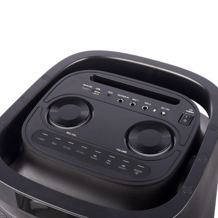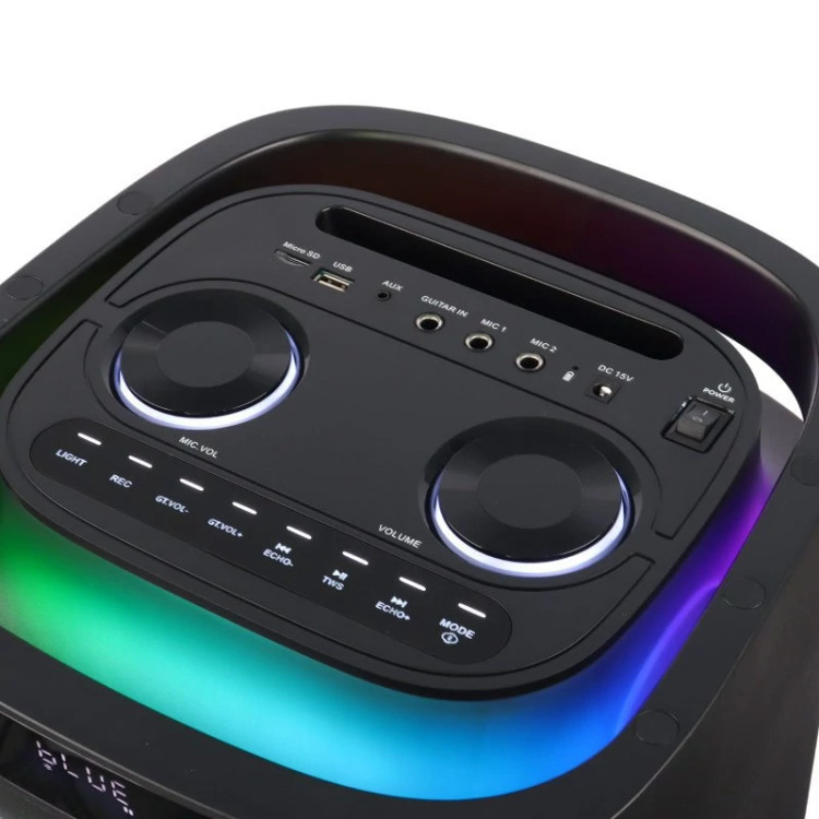 اسپیکر چمدانی بلوتوثی رم و فلش خور Verity V-PS2309 + میکروفون و ریموت کنترل اسپیکر چمدانی بی سیم قابل حمل وریتی مدل V-PS2309 همراه با میکروفون و ریموت کنترل برخورداری از کلید های فیزیکی به منظور مدیریت موسیقی، تنظیم ولوم، نورپردازی و ...، مجهز به نمایشگر و نشانگر LED جهت اطلاع از وضعیت کارکرد محدوده پاسخ فرکانسی 55 هرتز تا 18 کیلوهرتز، میزان امپدانس 4 اهم، حساسیت ورودی برابر با 92 دسی بل و نسبت سیگنال به نویز 70 دسی بلی بهره مندی از دو عدد ورودی میکروفون و یک ورودی گیتار، اقلام همراه محصول شامل یک عدد میکروفون بی سیم، ریموت کنترل و آداپتور مجهز به نورپردازی RGB به منظور ایجاد جلوه بصری زیبا در محیط کم نور و تاریک، سهولت در حمل و نقل با وجود دسته و چرخ پشتیبانی از فناوری TWS جهت اتصال دو یا چند دستگاه هم مدل به یکدیگر و پخش فایل ها بصورت همزمان از یک منبع بلوتوثی بدنه ساخته شده از جنس پلاستیک و فلز مقاوم در برابر فشار و ضربه، امکان دریافت امواج FM در بازه ی 87.5 الی 108 مگاهرتز تامین انرژی از طریق باتری داخلی و قابلیت شارژ مجدد محصول از طریق درگاه سوزنی و اتصال به برق شهری با آداپتور همراه پشتیبانی از فلش مموری USB و کارت حافظه میکرو SD جهت پخش فایل های ذخیره شده، پشتیبانی از فرمت صوتی MP3 نحوه اتصال بی سیم از طریق بلوتوث با برد اتصال تقریبی 10 متر و باسیم توسط رابط جک 3.5 میلی متری صدا برخورداری از 2 ساب ووفر 8 اینچی و یک توییتر 1 اینچی با توان خروجی کلی 160 وات، دارای قابلیت کارائوکه مشخصات محصول نوع محصول اسپیکر بلوتوثی اسپیکر چمدانی اسپیکر شارژی چرخ جهت حمل آسان محدوده توان 51 وات به بالا رابط جک 3٫5 میلی متری صدا USB بلوتوث قابلیت شارژ مجدد از طریق پورت سوزنی و کابل همراه پشتیبانی از رادیو FM در بازه فرکانسی 87.5 - 108 مگاهرتز پشتیبانی از رابط AUX دارد پشتیبانی از بلوتوث دارد نشانگر LED دارد پشتیبانی از کارت حافظه Micro SD دارد پشتیبانی از فلش مموری USB دارد وزن 13.4 کیلوگرم اقلام همراه شارژر/ میکروفون/ ریموت کنترل تامین انرژی از طریق باتری داخلی تعداد و سایز ساب ووفر 2 عدد 8 اینچی کلید فیزیکی به منظور مدیریت موسیقی، میزان صدا، Mood و ... توان خروجی RMS 160 وات درگاه ورودی گیتار 1 عدد توییتر 1*1 اینچ امپدانس 4 اهم دسته جهت سهولت در حمل و نقل حساسیت سیگنال به نویز 70 دسی بل نمایشگر LED دارد ابعاد 70.5×32×30.5 سانتی متر ریموت کنترل دارد پشتیبانی از TWS دارد برد اتصال بلوتوث 10 متر جنس بدنه پلاستیک و فلز قابلیت کارائوکه دارد درگاه میکروفون 2 عدد